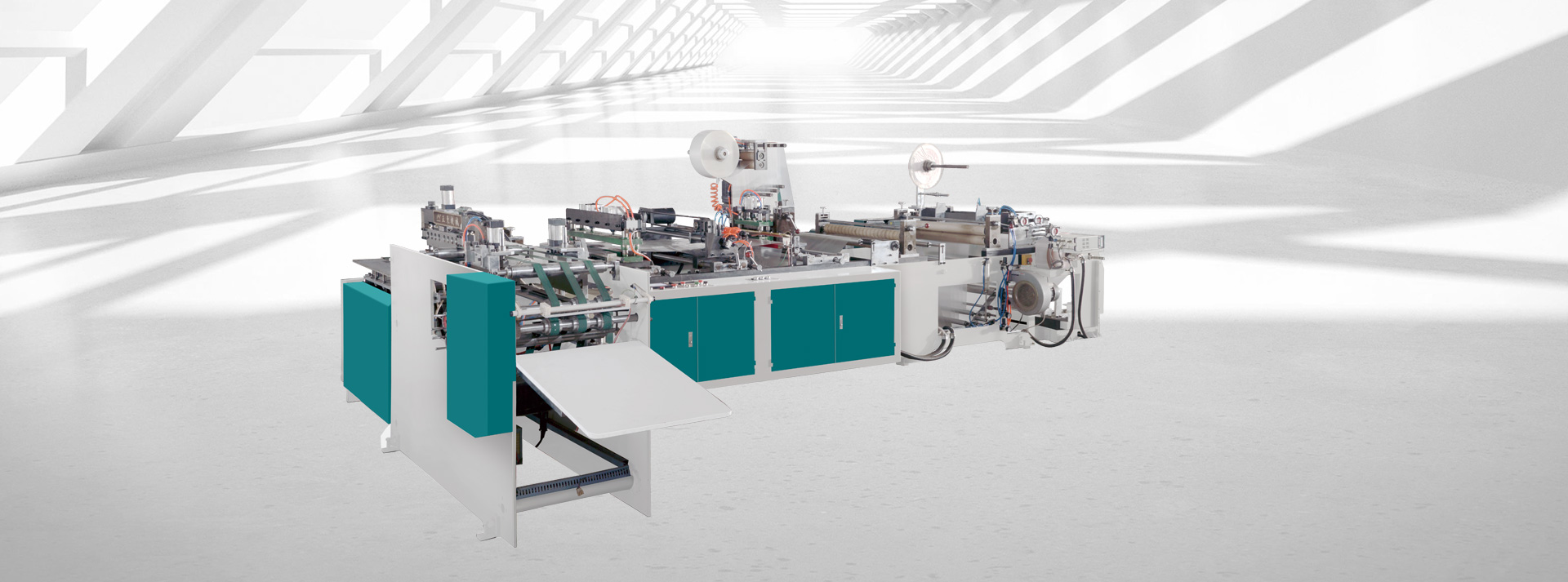 该机是一台专业生产PP书皮袋(书套袋),采用PP片材卷料从放卷到成品全自动制作。
