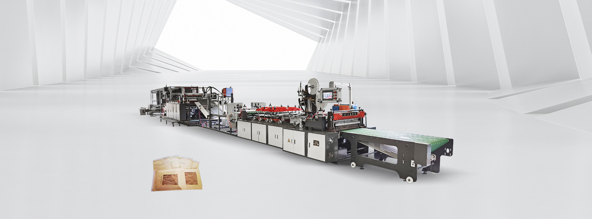 该机是专为生产蜂窝纸芯缓冲快递袋而研发的制袋生产线,它由电脑与10几个伺服组成一个全闭环的控制系统,从两层牛皮纸的放卷、蜂窝纸的衬入、上胶粘合、到压封剪切成型,均在生产线上一次完成,整条生产线在做小袋子时还可以一次出二个袋子,以提升制袋效率。