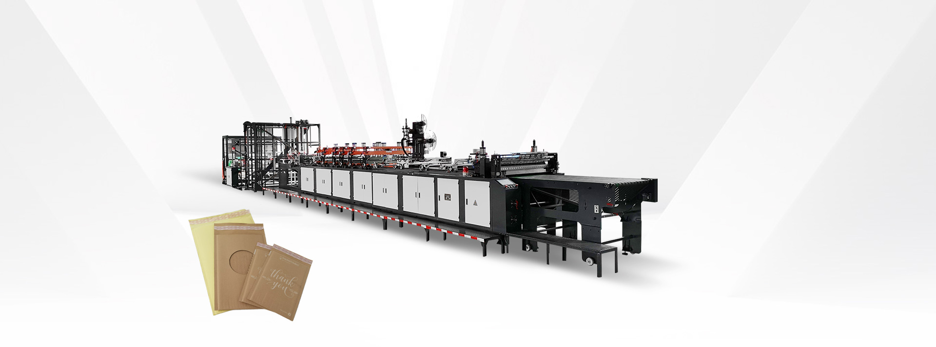 该机是为复合好的压泡纸与瓦楞纸而研发的机型,它可以一出一或一出二进行制袋。